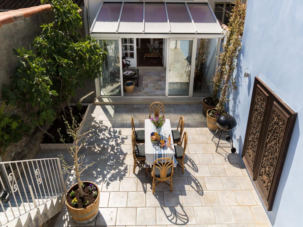 Le salon ouvre sur une verranda donnant accès à la cour intérieure. Vous y trouverez un petit coin table basse avec deux chaises pour se détendre autour d'une tasse de thé et un bon livre ainsi qu'un nouvel espace dînatoire.