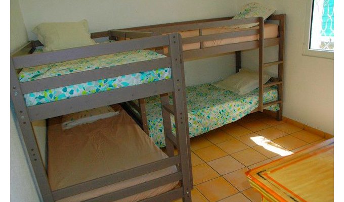 Chambre enfants : 4 lits superposés (90 cm) – lits du bas adaptés aux adultes.