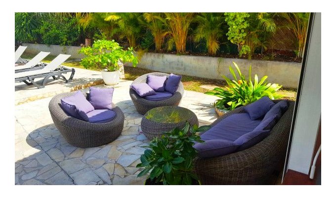 Un salon de jardin ombragé sous les cocotiers, idéal pour lire à l’écart de l’agitation.
