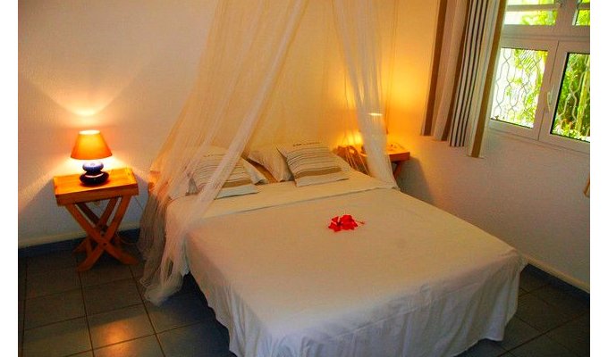 Chambre indépendante : lit 160 cm avec moustiquaire, bureau, terrasse privée, grande salle d’eau avec WC (partagée avec la chambre enfants).