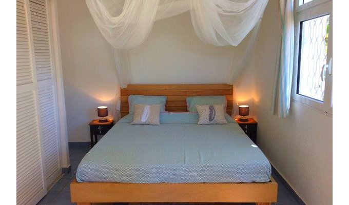 Suite parentale : lit à baldaquin 160 cm avec moustiquaire, bureau, salle d’eau privative avec douche à l’italienne et WC, accès direct piscine & océan.