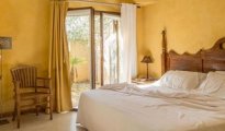 Chambre à deux lits avec des portes s'ouvrant sur le jardin.