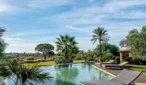 La grande piscine de la villa avec de grands coussins et de belles chaises longues.