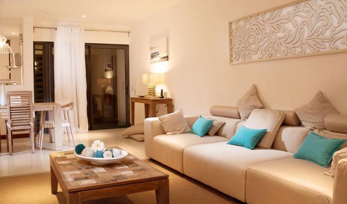 L'appartement dispose de trois chambres climatisées et de deux salles de bains ainsi qu'une cuisine et un espace de vie ouvert avec un accès direct à la terrasse.