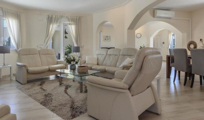 La villa s’ouvre sur un spacieux hall d’entrée menant à un grand salon lumineux avec deux espaces de détente, dont l’un dispose d’un canapé-lit double permettant d’accueillir jusqu’à 8 personnes.