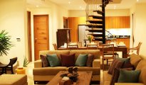 Un mobilier aux tons de terre, des canapés moelleux et des accents de bois se combinent pour créer une ambiance chaleureuse et conviviale dans la villa. Les grandes fenêtres de la galerie créent des intérieurs éclairés par le soleil. Le salon principal présente un agencement décloisonné. Un salon intérieur, meublé avec des canapés, des oreillers et une table basse, comprend un coin repas et une cuisine ouverte. Des portes coulissantes en verre encadrent le salon, offrant un accès facile au jardin.