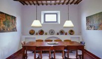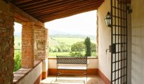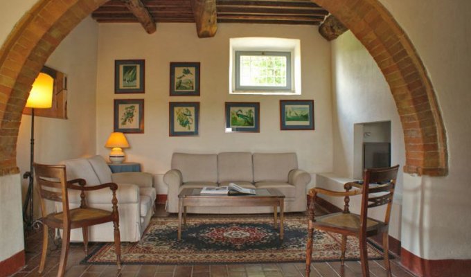 La Villa est un ancien oratoire du XVè siècle; reconvertie une première fois en ferme en 1876, la propriété a fait l'objet d'une belle restauration, et a retrouvé sa structure d'origine pour devenir une belle résidence de campagne. La maison, qui fait partie d'un domaine historique près de Castellina in Chianti, est située sur un coteau d'où l'on jouit d'un beau panorama sur la campagne siennoise et le Chianti, jusqu'au tours de Monteriggioni. Les vastes espaces extérieurs aménagés qui l'entourent sont à l'unisson; une belle loggia avec table et barbecue, piscine de forme irrégulière (7x14m ) avec pool house. La Villa offre un ameublement simple mais confortable ainsi que l'air conditionné au premier étage et une buanderie avec lave-linge. Peuvent être organisés au préalable et réglés sur place : heures de ménage, service cuisine, changement de linge durant la semaine, dîner toscan à base de produits locaux (une fois par semaine) et visites dans les caves à vins du domaine .