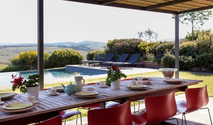 La Villa est située à 30 km au sud-est de Sienne, au cœur de la Toscane, magnifique villégiature bâtie sur ancienne ferme. Récemment rénovée, le style de son extérieur est représentatif des grandes propriétés des Crete Senesi et se situe sur la crête d'une colline. L'ameublement des intérieurs dans un style minimaliste s'intègre harmonieusement au passé rural de la ferme.