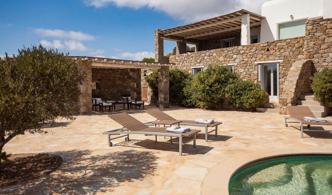 Cette villa est située au sud de Mykonos, au sommet d'une petite colline surplombant la plage de Lia.