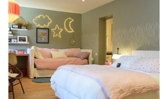 Le rez-de-jardin comprend une suite parentale avec sa salle de bains (baignoire et deux douches) et WC, une deuxième chambre avec salle d’eau et WC et une troisième chambre indépendante avec salle d’eau et WC.