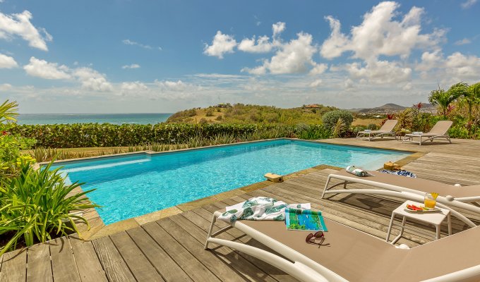 Villa de plain pied, elle possède une vue mer extraordinaire dont vous pourrez profiter lors de vos repas sur la terrasse ou lors de vos bains de soleil au bord de la piscine privée.