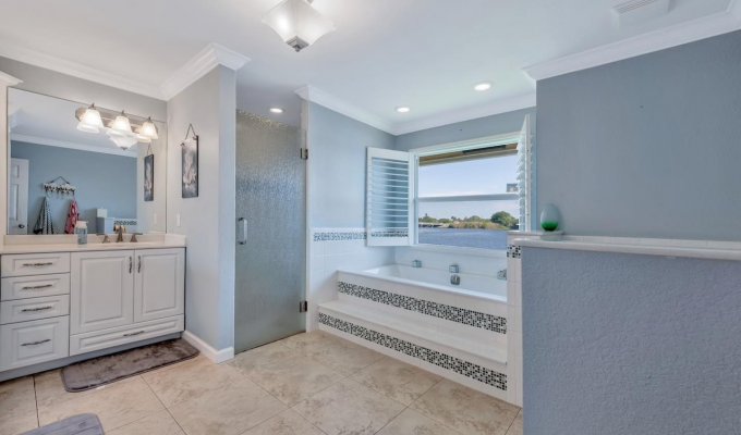 La maison dispose d'un espace extérieur incroyable avec une piscine privée cristalline et un bain à remous relaxant donnant sur l'eau.