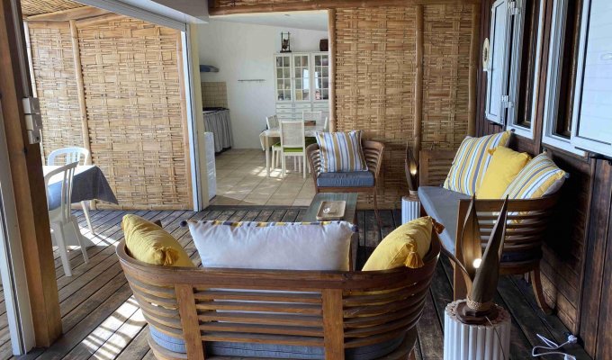 Les pieds dans l'eau, accès direct au lagon, au milieu d'un jardin tropicale et belle vue sur la mer. Il y a 1 véranda, 1 séjour avec 2 canapé-lits, 3 chambres double climatisées, 2 salles d'eau int et ext, cuisine équipée LV LL. Wifi. Tout confort. BBQ.