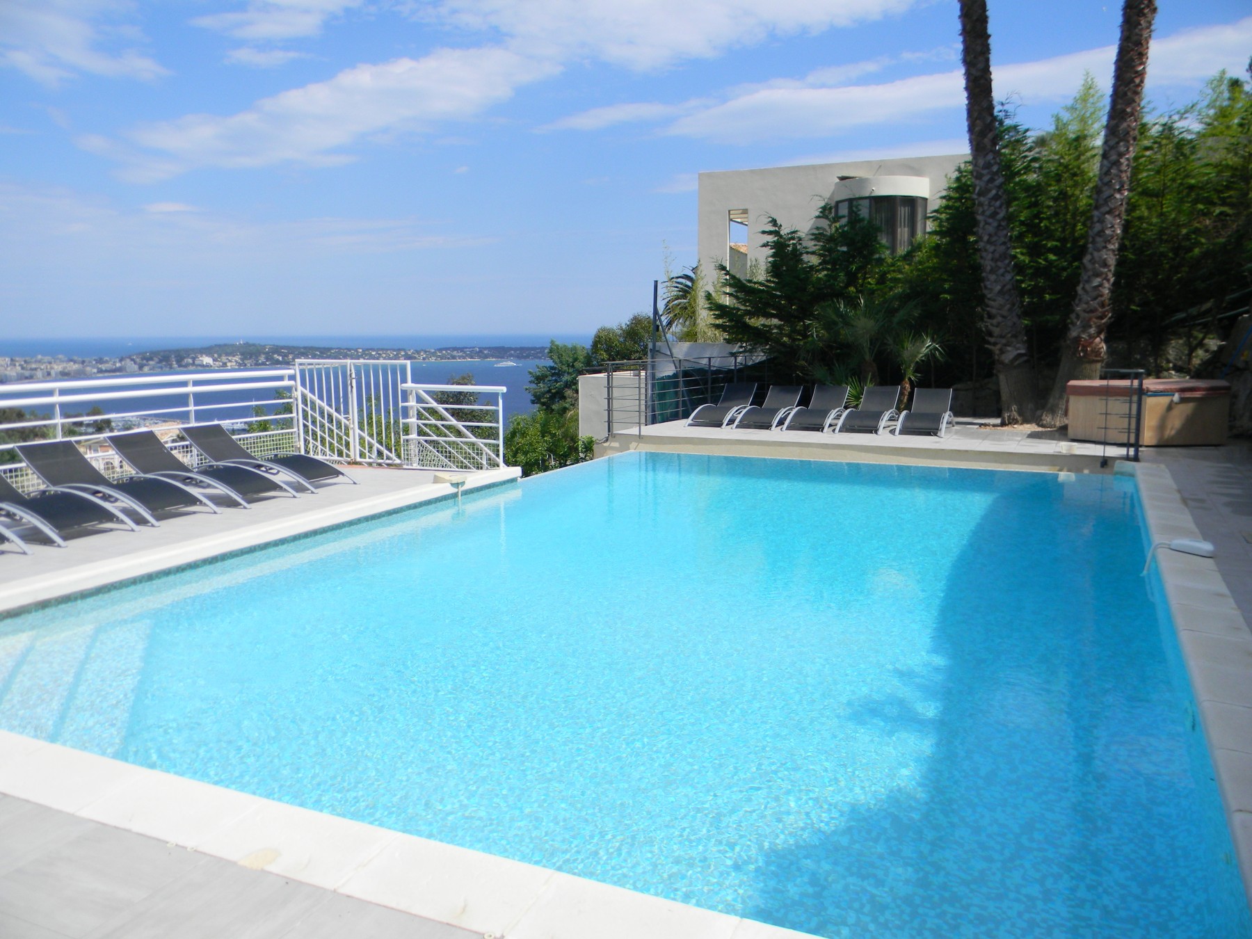 A 7 km du Palais des festivals dans le quartier privilégié de Super Cannes, belle villa contemporaine située sur un terrain de 2500m². Piscine à débordement (10m X 6m), transats. Vue mer panoramique. Vastes terrasses (300m²) dont 1 solarium avec salon de jardin et transats. Parking 4 voitures.