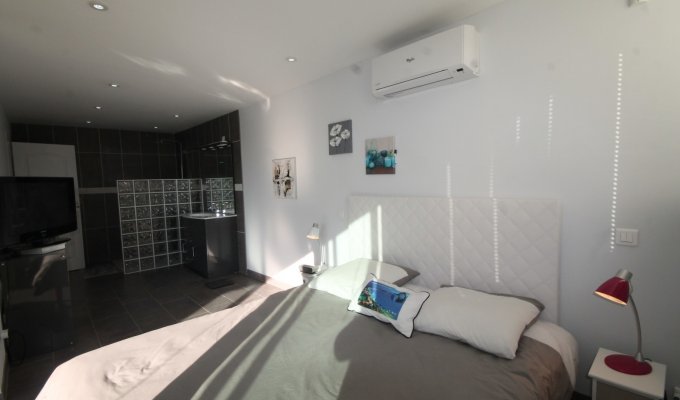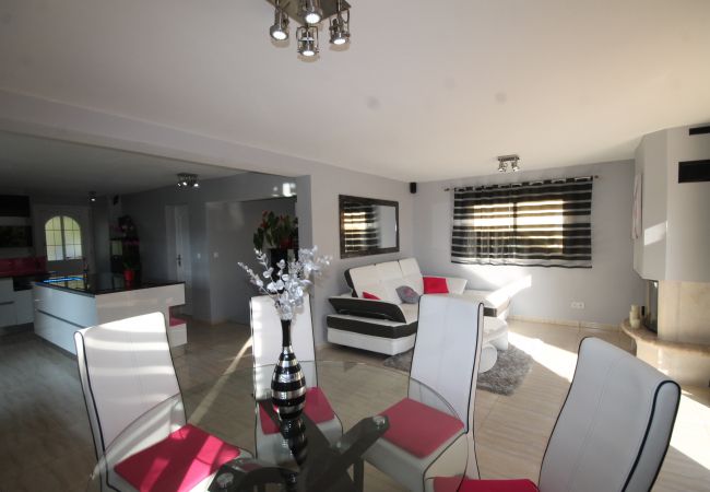 Villa de 180m² sur 2 niveaux avec : Séjour/Salle à manger climatisé avec TV (FreeBox), Internet. Cuisine ouverte entièrement équipée. Salle d’eau/WC.