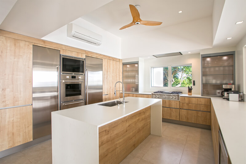 Les espaces intérieurs comprennent un élégant salon et salle à manger et un coin avec télévision connectée de 82 pouces. À gauche se trouve la cuisine en bois clair, un îlot central et un bar. La cuisine et le salon ont des portes coulissantes en verre qui peuvent être fermées pour fournir un espace climatisé. La terrasse extérieure couverte offre également un coin salon extérieur très confortable.