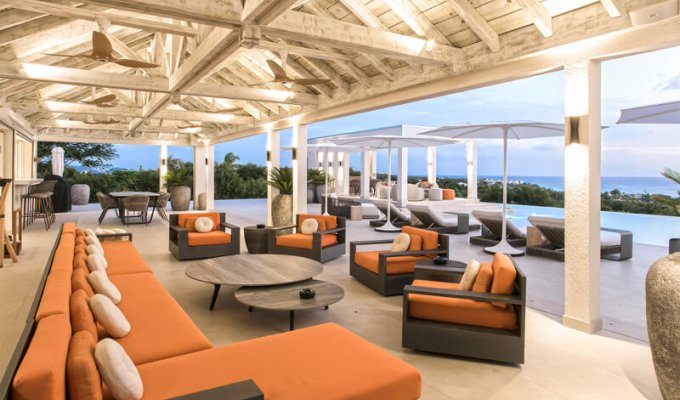 Les portes s'ouvrent sur un immense espace de vie intérieur / extérieur avec une vue panoramique à 180 degrés sur l'océan avec Saba à l'horizon lointain et une pelouse verdoyante au premier plan. Les lignes architecturales épurées d'un belvédère au bord de la piscine et d'une piscine d'eau salée en forme de L sur toute la longueur de la terrasse rehaussent la vue. Au bord de la piscine, il y a des chaises longues et parasols pour se prélasser.