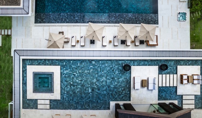 La villa est entourée de verdure tropicale luxuriante et donne sur les eaux bleues azur de la mer d'Andaman, créant ainsi l'ambiance paisible parfaite pour se détendre complètement avec vos proches. La propriété comprend non pas une mais deux magnifiques piscines à débordement, une à chaque niveau du grand pavillon à deux étages. C'est une expérience extraordinaire que de plonger dans l'eau cristalline de la piscine et de se détendre sur les chaises longues doubles dans l'eau, en contemplant la vue sur l'océan et les montagnes lointaines. Sur la terrasse ensoleillée, de nombreux transats ombragés par de grands parasols bleus apaisent à la fois ceux qui veulent bronzer et ceux qui veulent lire. Les clients peuvent également se prélasser dans l'un des deux jacuzzis pour une sensation de luxe ultime en vacances. Le pont supérieur est bordé d'une barrière de protection en verre et il y a un gazebo avec un canapé-lounge en contrebas, parfait pour profiter des boissons au coucher du soleil l'après-midi.
