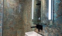 Produits de toilette de la marque CODAGE dans les salles de douche et plateau de courtoisie dans la cuisine.