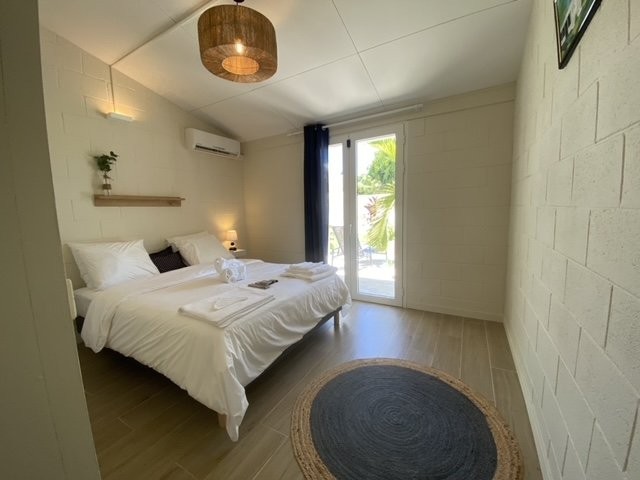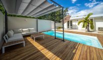 Location saisonnière à Saint-Gilles-Les-Bains, plus précisément à Grand Fond, Cette magnifique villa de 133 m2 de surface habitable entièrement rénovée et meublée en fin 2021, implantée sur un terrain entièrement clôturé, arboré et gazonné, avec une superbe piscine et sa plage en caillebotis de 29 m2.