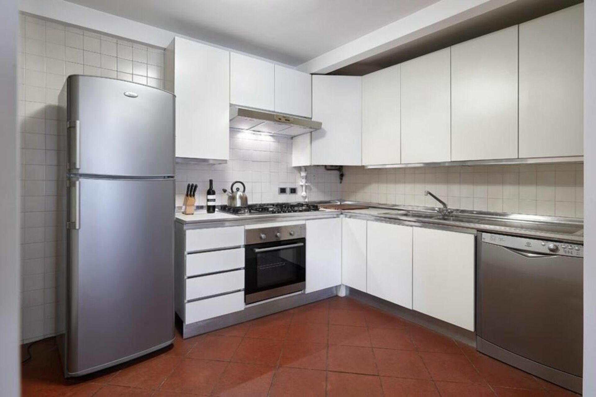 Cet appartement moderne (200 m² - 2152 pieds carrés) est aménagé sur deux niveaux. Lorsque vous entrez dans l'appartement, vous serez accueilli par le salon lumineux qui surplombe le dôme du Duomo de Florence. Sur votre droite se trouve la cuisine bien équipée et à partir de là, dans un débarras séparé, vous trouverez la machine à laver qui fait aussi sèche-linge. Le salon auquel vous accédez en entrant dans la maison est également salle à manger avec une table pour 8 personnes. De ce niveau, vous pouvez monter 12 marches d'un escalier qui vous mène à l'étage supérieur où se trouve un autre petit salon, avec des fenêtres sur le toit, muni de deux canapés. Voici également la première chambre double (largeur matelas 160 cm - non divisible). Cette chambre n'est pas séparée par des portes ou des murs et donne directement sur le salon supérieur. Également à ce niveau, vous trouverez la première salle de bain avec baignoire.