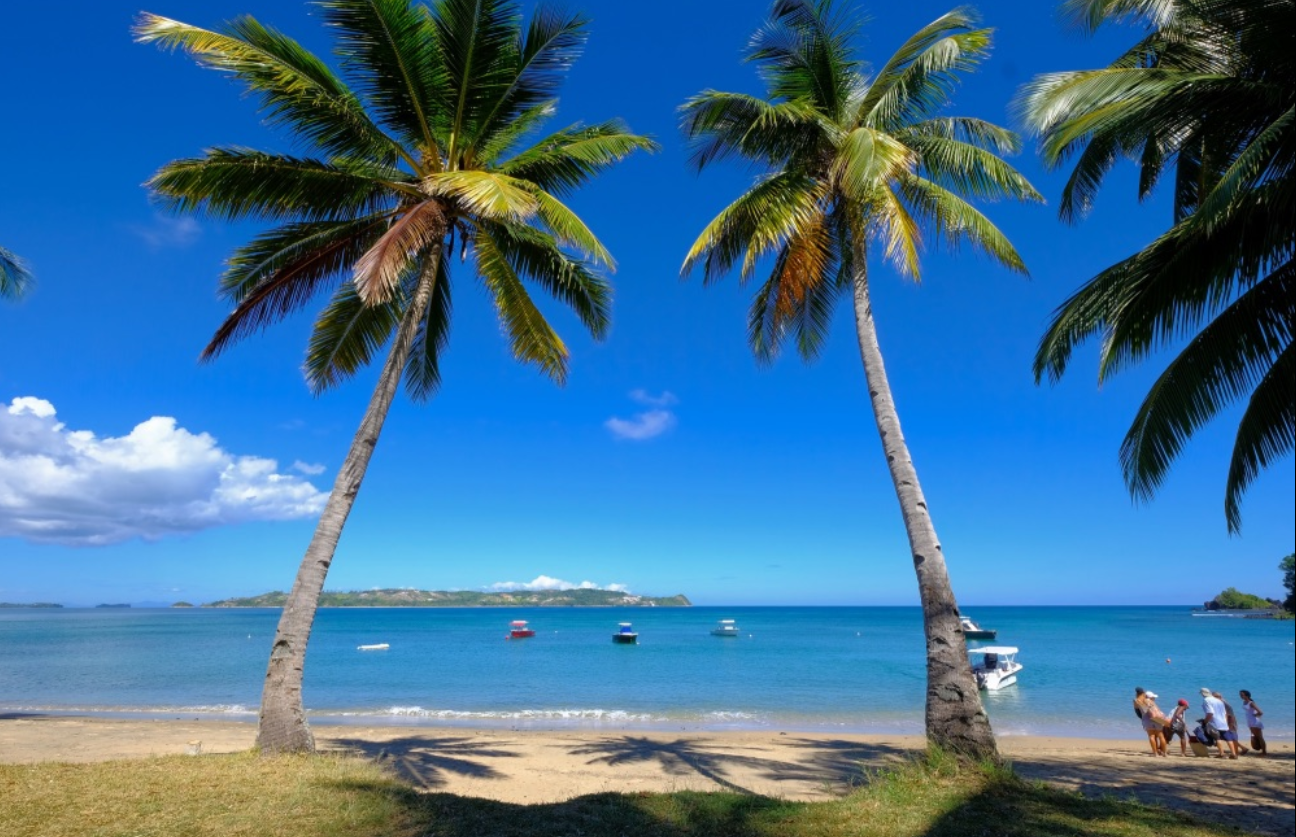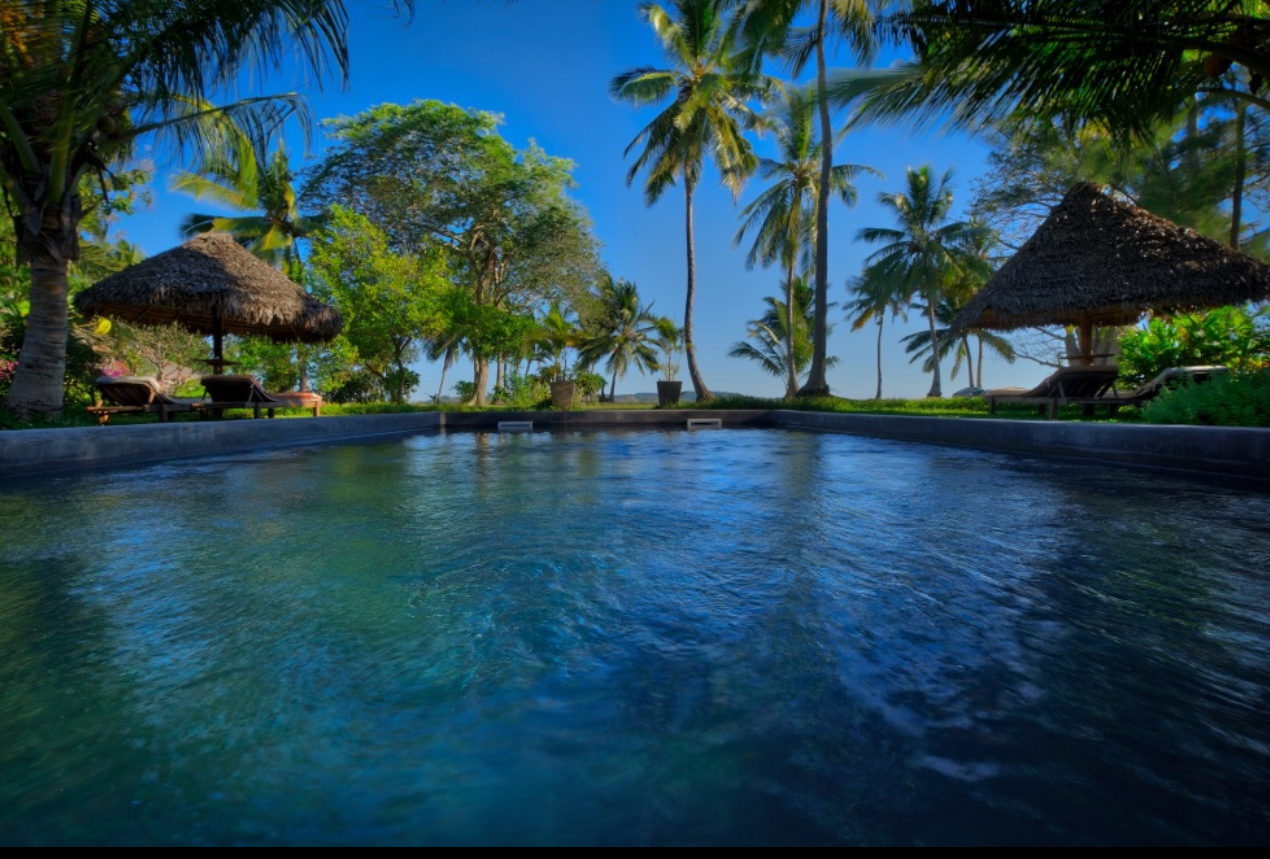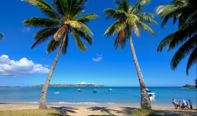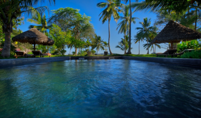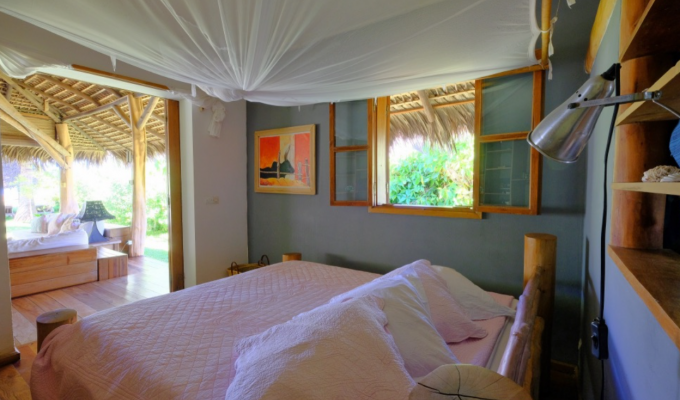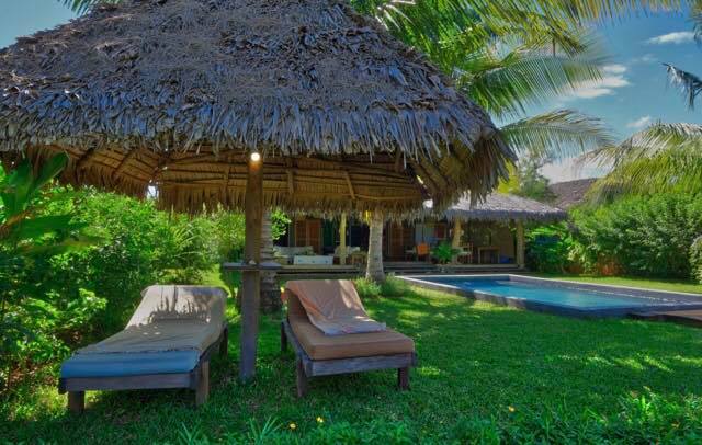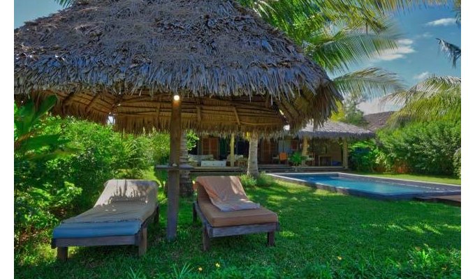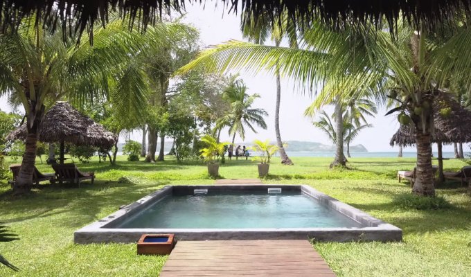 Devant la villa, une petite cocoteraie débouche sur une plage, au large s'étend l'île de Sakatia.