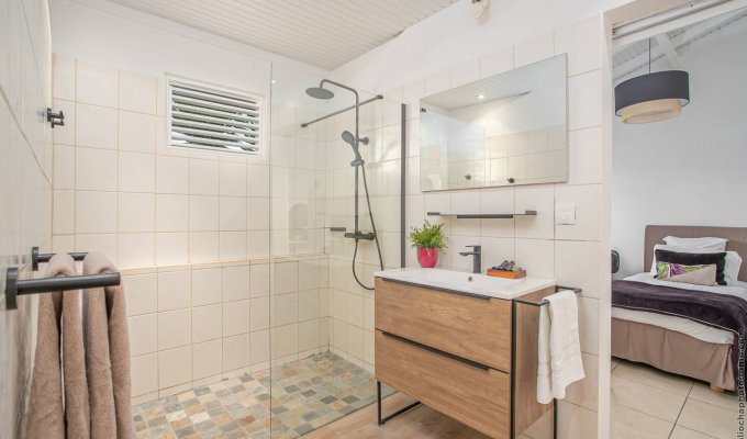 Trois spacieuses chambres vous attendent déjà, au coeur de cette villa au charme architectural certain. En détail, nous comptons une superbe suite principale composée de sa salle de bain et privative (Lit King Size), et deux charmantes chambres doubles (L’une composée d’un Lit King Size et l’autre, de deux lits single pouvant être rapprochés afin d’en faire un grand lit King Size), toutes deux partageant la même salle de bain, composée d’une belle douche à l’italienne et d’une jolie vasque.
