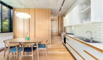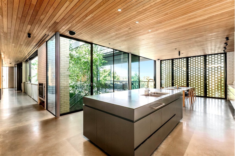 Cette maison est une juxtaposition d'un design minimaliste complété par des tons chauds et riches en bois, le tout entouré d'un environnement verdoyant. Elle regorge d'espaces de vie lumineux, dont la pièce maîtresse est l'étonnante cour centrale conçue par Fiona Brockhoff, idéale pour se détendre et se divertir. Vous pouvez y siroter votre café du matin ou partager un verre avec des amis, le tout en toute intimité au milieu des arbres.