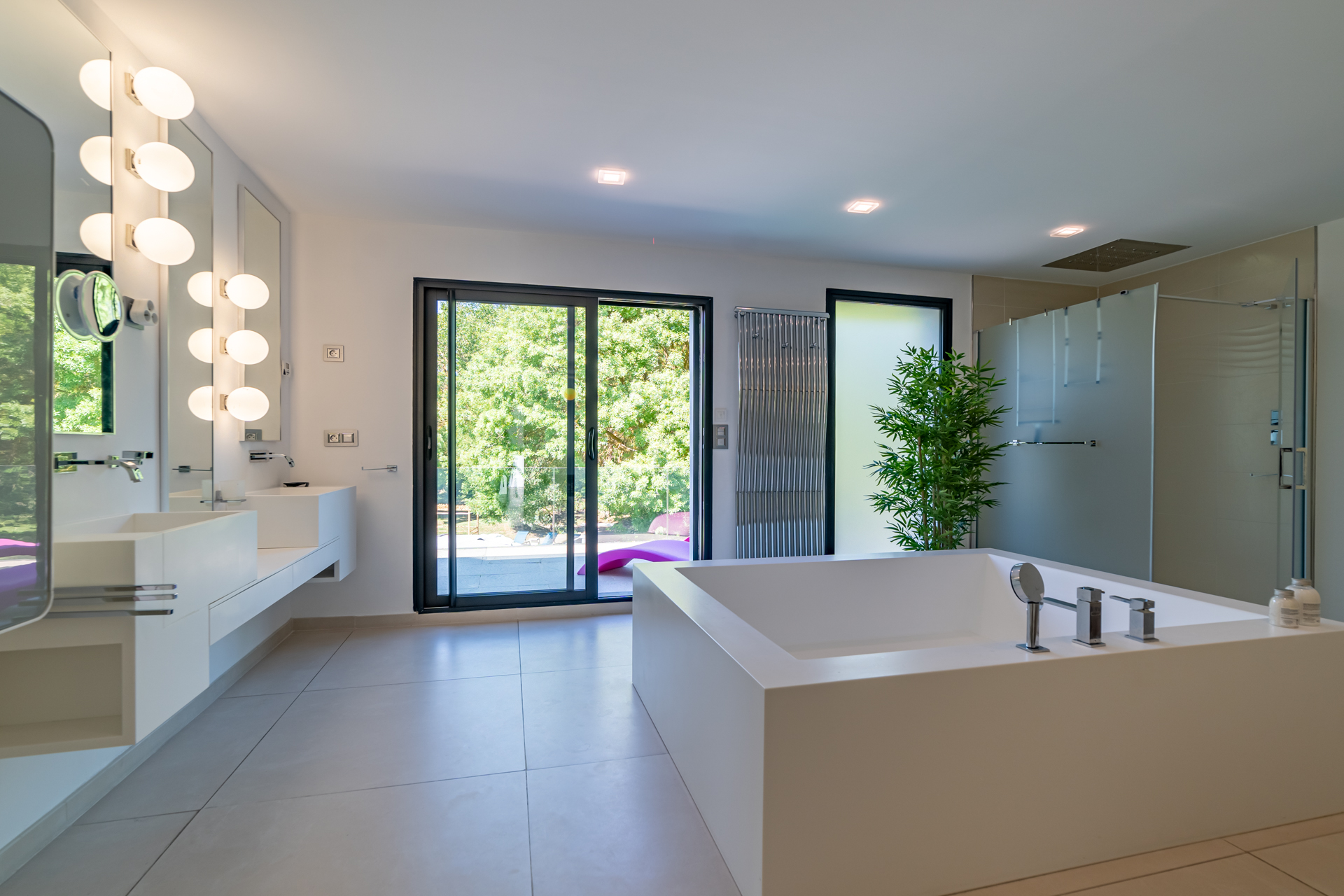 La surface totale de la villa est d'environ 500m2, elle est entourée d'un magnifique parc et dispose d'un court de tennis, d'un lac et d'une double piscine à débordement et d'un terrain de boules (pétanque). Une table de ping-pong est également à disposition sur l'une des nombreuses terrasses.