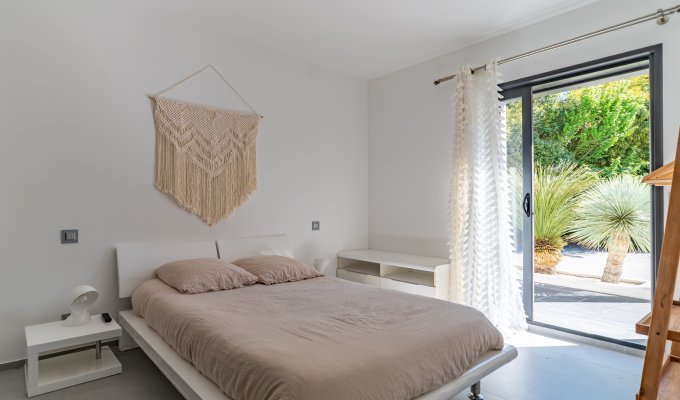 Au rez-de-jardin se trouve une chambre double avec salle de douche attenante et accès direct à une terrasse orientée à l'est. Du côté ouest, en passant par un couloir, une chambre studio offre trois lits simples, un canapé-lit double, une kitchenette et une salle de bains, cette chambre a un accès direct à la terrasse côté ouest.