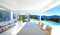 Une véritable expérience de luxe. Immergez-vous dans la piscine chauffée de style Santorin et dans le spectaculaire espace de réception en plein air, avec en toile de fond une vue à 360 degrés sur la ligne d'horizon et les montagnes. Derrière les doubles portes d'inspiration française, vous trouverez un somptueux couloir qui mène à la salle à manger formelle et à la pièce maîtresse de la maison - un vaste espace de vie ouvert, doté de fenêtres allant du sol au plafond et offrant une vue sur les montagnes luxuriantes.