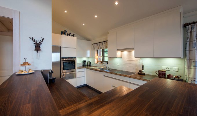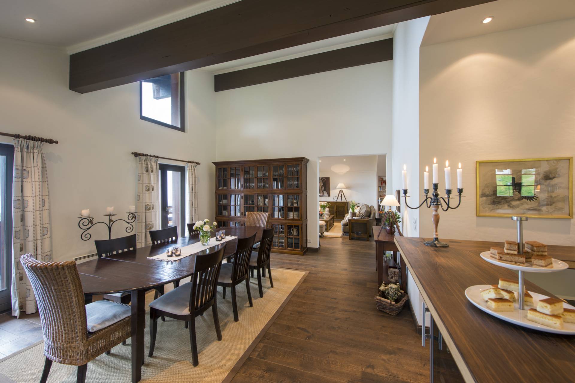 Vous serez ici comme chez vous, tout ayant été pensé pour votre confort et votre sérénité. Les larges canapés du salon font face à une cheminée de pierre rustique, non loin d’un coin bibliothèque et d’un espace réservé à la lecture avec de charmants fauteuils en osier. Poutres apparentes et objets d’artisanat local rappellent l’architecture traditionnelle des chalets suisses mais la hauteur sous plafond, rehaussée par la blancheur et la sobriété des murs, donne surtout une impression d’espace et de modernité.