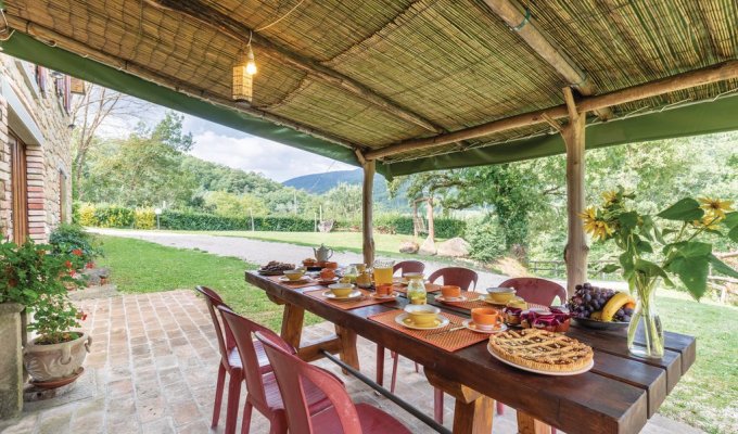 Entre Città di Castello et Cortona (22 km chacune) se trouve cette maison de vacances avec piscine privée au milieu des collines. Au-dessus de la piscine, du côté vers la vallée de la maison, salon et la cuisine-salle à manger, avec salle de bain et douche ; du côté de la montagne, par des entrées indépendantes de plain-pied, 3 chambres (chacune avec salle de bain et douche ouverte) ; et 2 galeries avec canapé-lit double l'une, avec un lit simple l'autre, chacune également avec salle de bain et douche. Lit bébé sur demande. Le gîte appartient à une exploitation agricole située un peu au dessus du petit village, où l'on peut également louer une dépendance avec trois couchages supplémentaires juste à côté (paiement sur place) et où d'autres chambres d'hôtes sont également louées. Chez le propriétaire, vous pourrez acheter sur place des légumes frais, de l'huile d'olive et du miel ; sur demande elle se fera un plaisir de cuisiner à ses hôtes des plats locaux (plats de pâtes de toutes sortes, sanglier) dans la petite trattoria de la ferme. L'atmosphère rurale est idéale pour les familles qui cherchent à être proches de la nature. Un petit lac de pêche est à votre disposition. D'ici, de nombreuses excursions sont possibles vers les villes voisines de l'Ombrie et de la Toscane telles que Città di Castello et Cortona (22 km), Arezzo, Pérouse et Gubbio (environ 50 km). 1 km S.Léo Bastia avec épicerie, bar, poste ; Trestina à 10 km avec magasins de toutes sortes.
