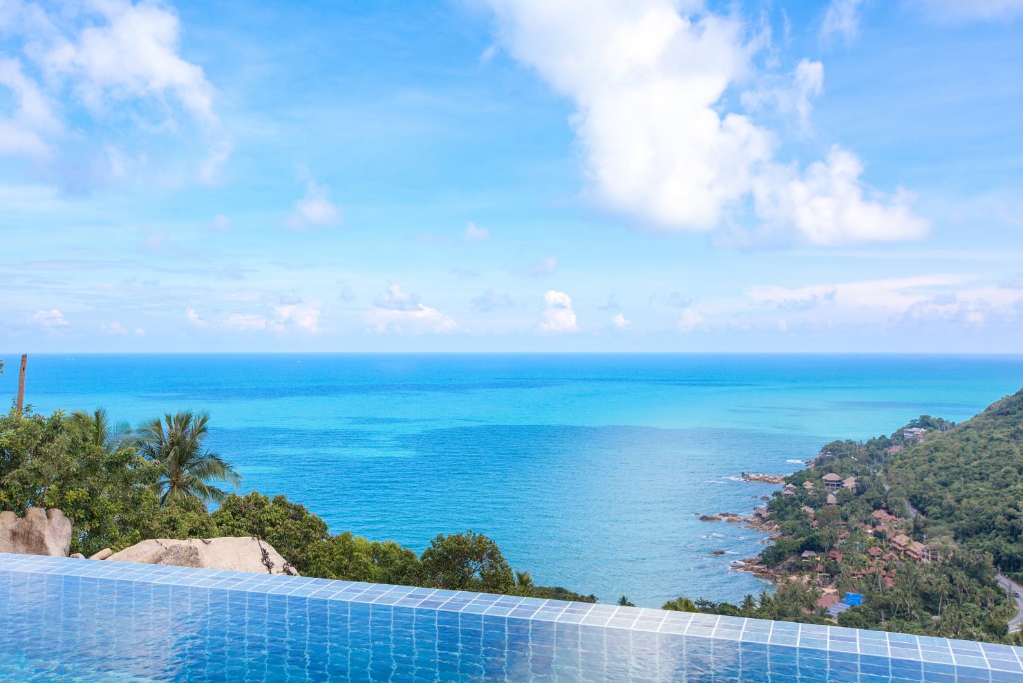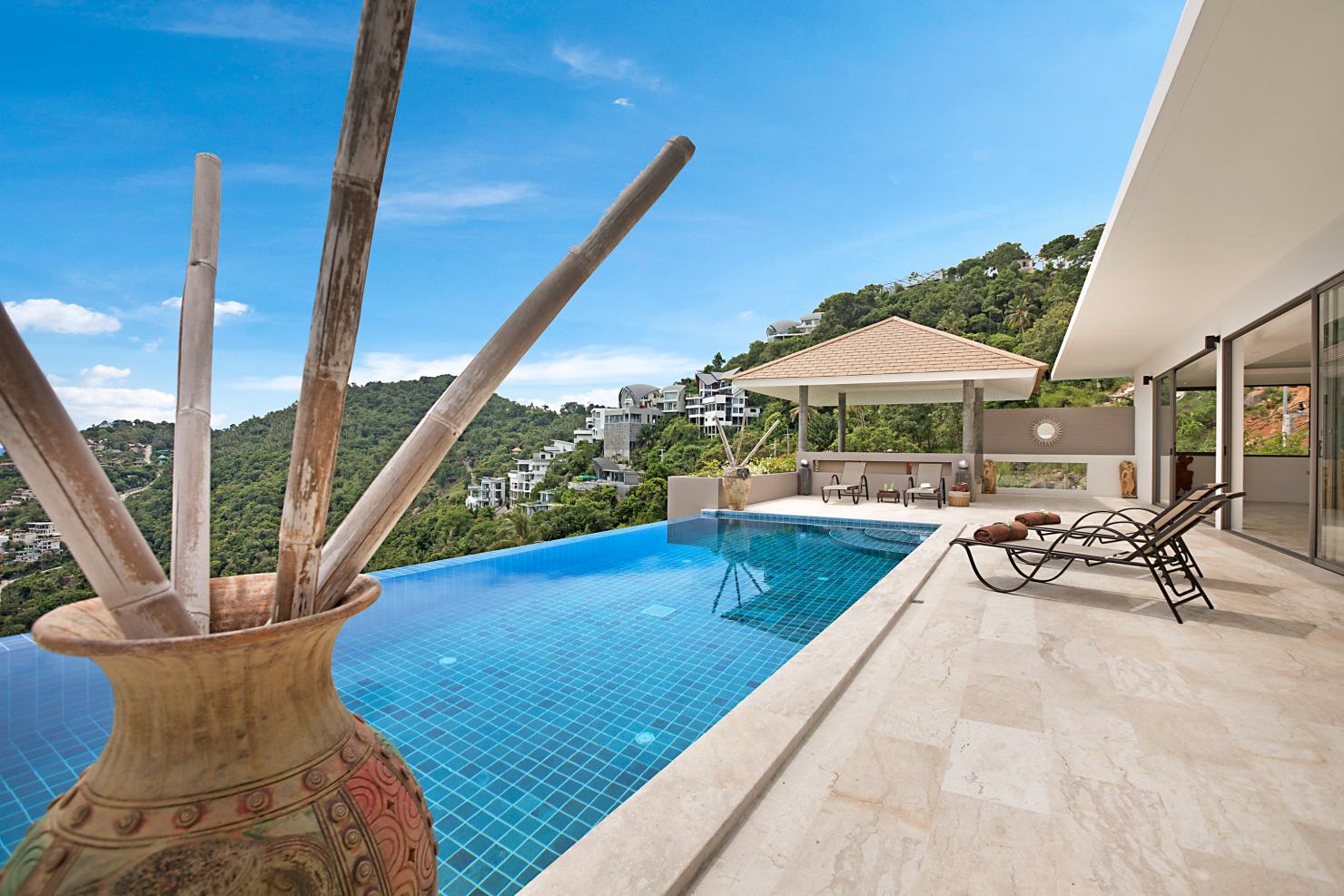 La Villa propose une grande piscine à débordement surplombant la baie de Chaweng, ainsi qu’un espace lounge de style Sala Thai et une vaste terrasse avec vue sur la mer.