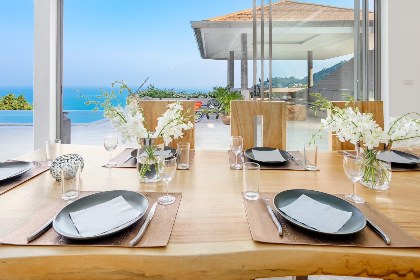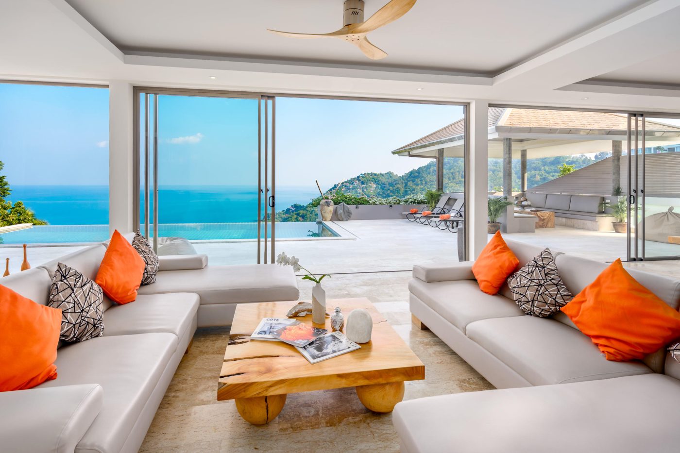 Il y a une cuisine européenne moderne entièrement équipée ainsi qu’un vaste salon et une salle à manger, tous offrant une vue imprenable sur la mer.