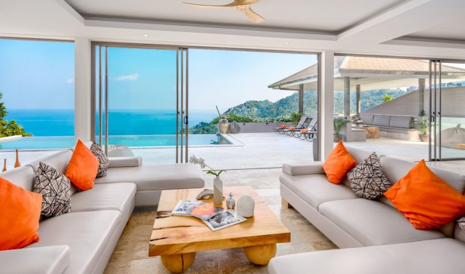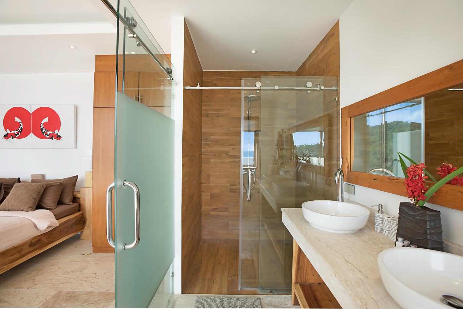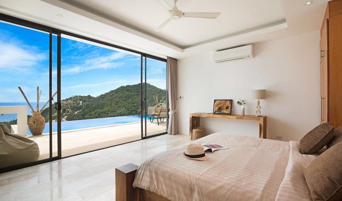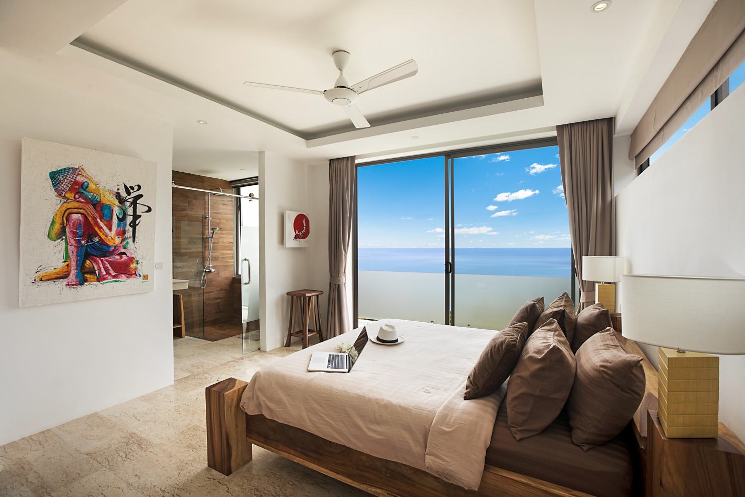 La villa dispose de 4 grandes chambres avec lits king-size, chacune avec sa salle de bain attenante et un balcon avec une vue spectaculaire sur l’océan. Toutes bénéficient de baies vitrées du sol au plafond afin de profiter pleinement des vues panoramiques. Une chambre offre une vue sur le jardin.