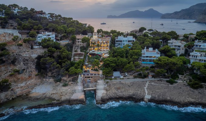 Située dans un cadre de rêve en bord de mer, dans le quartier résidentiel exclusif de La Mola, cette magnifique villa offre une vue imprenable sur la paisible baie de Cala Marmassen, à seulement une minute du port animé et cosmopolite d’Andratx. Cala Marmassen ne dispose pas de véritable plage de sable, ce qui permet à la baie de conserver tout au long de l’année une atmosphère intime et préservée, les touristes et les bateaux préférant généralement d’autres lieux. L’accès privé à la mer, au quai et à l’anneau d’amarrage se fait par quelques escaliers à travers de magnifiques jardins en terrasses.