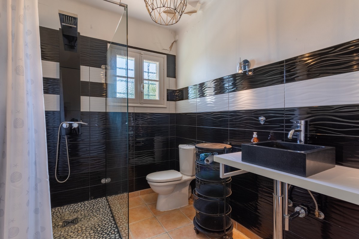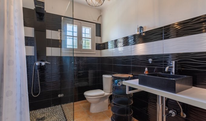 La partie principale de plain-pied avec l'entrée se compose d'un espace cuisine entièrement équipé, séjour/salle à manger avec cheminée, 2 chambres (2*90 + 1*160), une salle d'eau avec WC, un WC indépendant et une grande terrasse équipée de coin repas pour 10 personnes. Un escalier vous conduira au dôme de la maison avec sa chambre et sa salle de bain