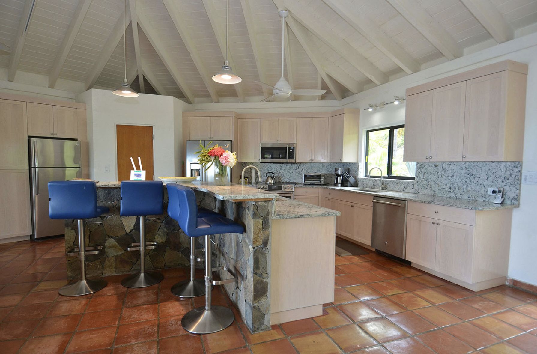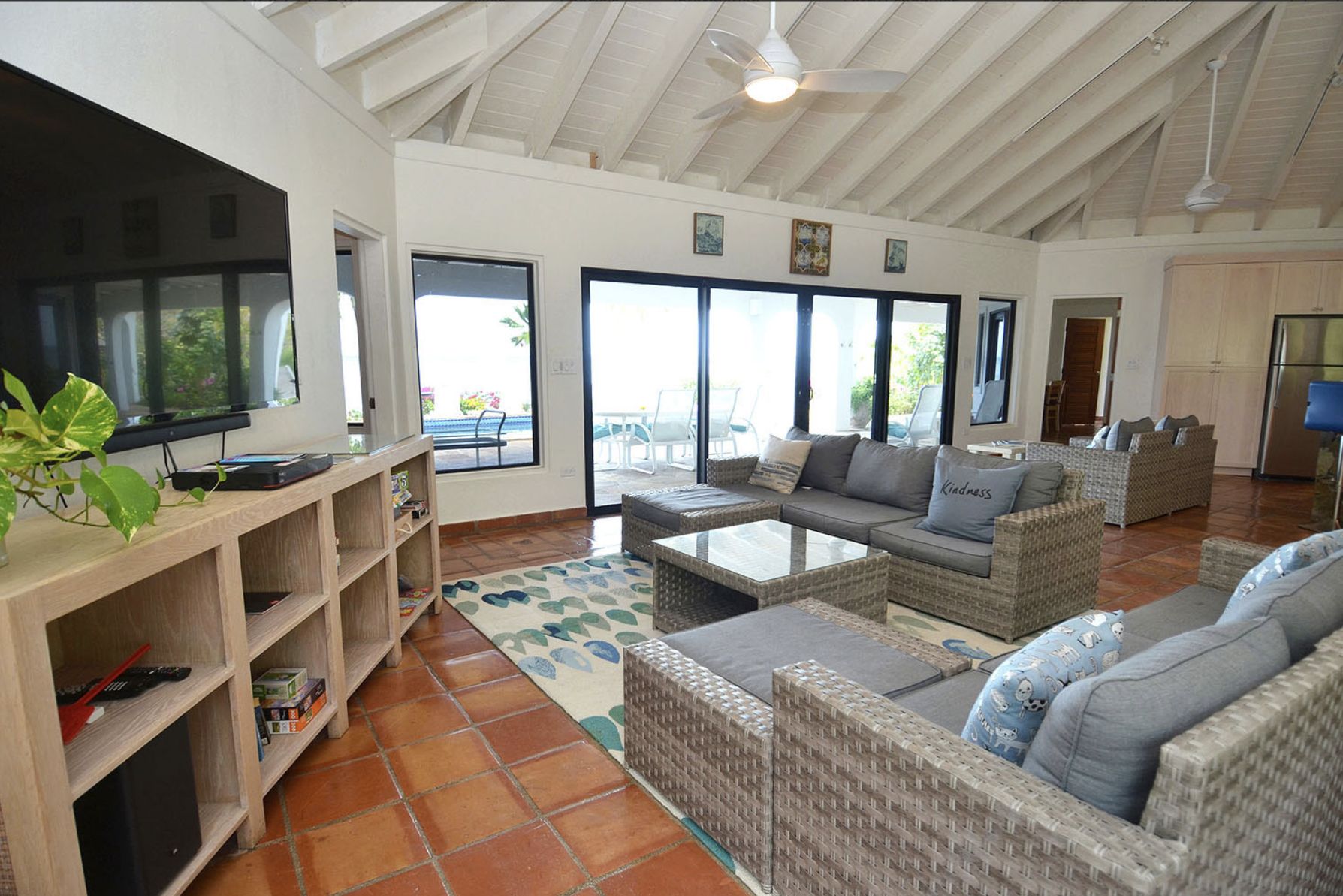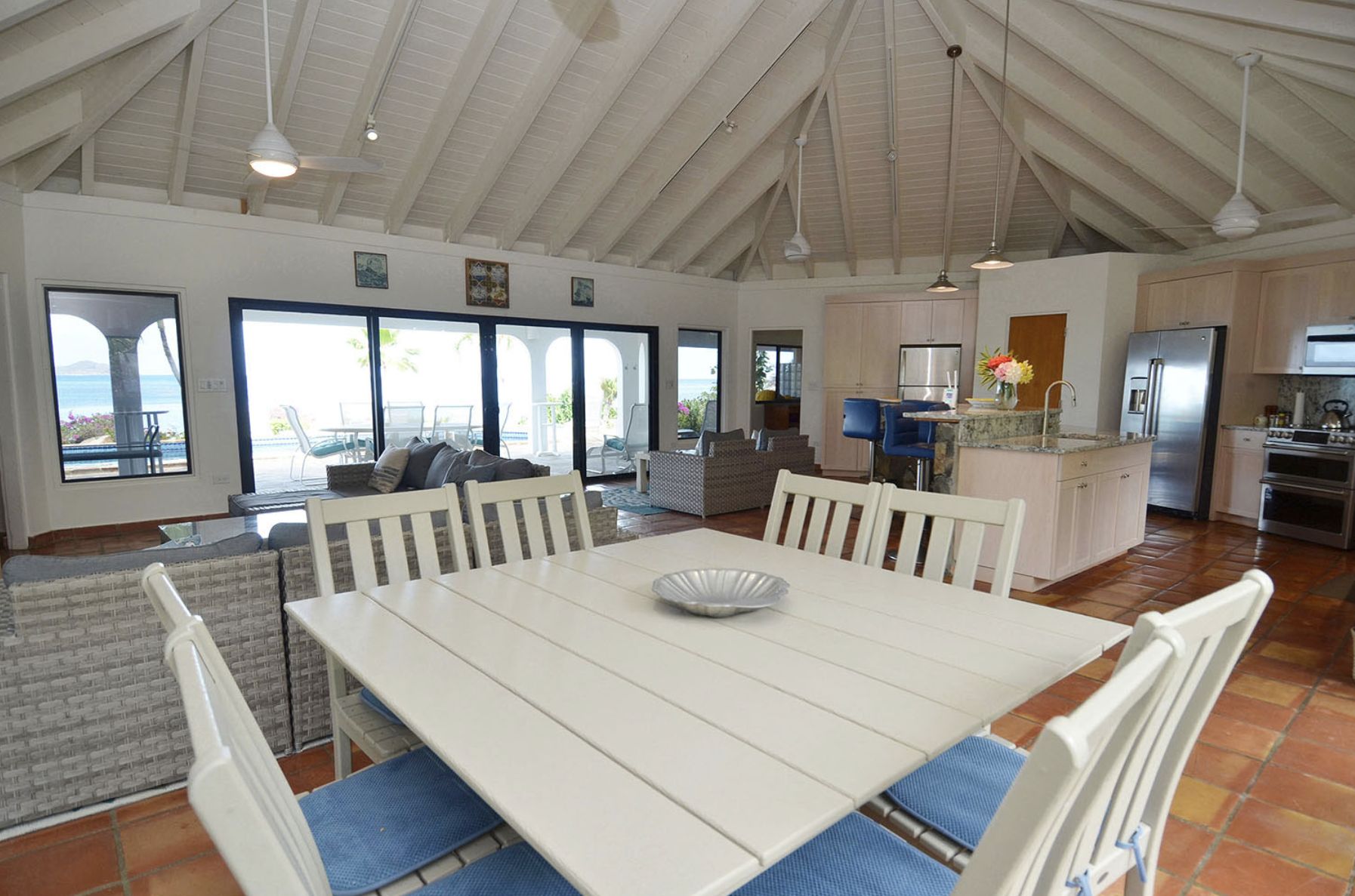 Chaque chambre est conçue comme une suite parentale, avec salle de bain attenante, climatisation, double vue sur l'océan et accès direct à l'extérieur. La villa offre tout le confort moderne, notamment une grande salle familiale et salle à manger, une cuisine professionnelle, une télévision avec magnétoscope et chaîne stéréo, une vaste bibliothèque de films et de livres, l'internet haut débit ADSL et la télévision par satellite avec HBO et Showtime.