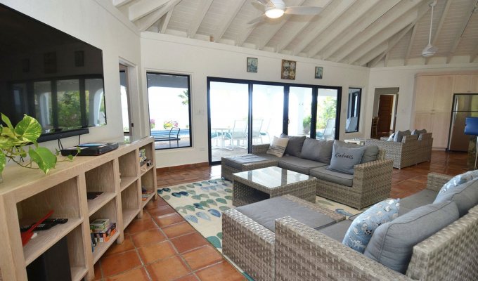 Située directement sur le sable blanc et doux de l'idyllique baie de Mahoe, cette superbe villa en bord de mer est un véritable havre de paix caribéen. Elle dispose de quatre suites climatisées, chacune avec sa propre salle de bain et une vue imprenable sur l'océan, toutes ouvrant sur une spacieuse terrasse en pierre naturelle avec une piscine étincelante et un jacuzzi pour huit personnes.