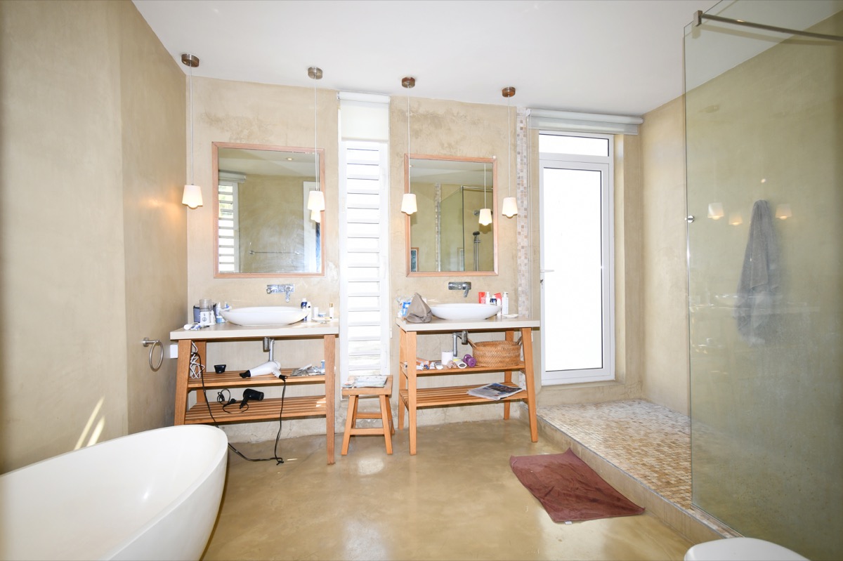 Chambre principale : Vue sur la mer, lit queen, dressing, salle de bains attenante avec baignoire + douche + WC, balcon privé