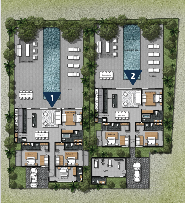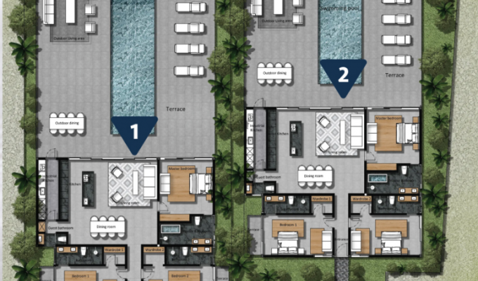 Deux villas spacieuses de plain-pied, V1 (4 chambres) et C1 (3 chambres), offrent chacune environ 400 m² d’espaces lumineux et ouverts donnant sur de vastes terrasses ensoleillées et une piscine privée de 15 × 3,8 m.