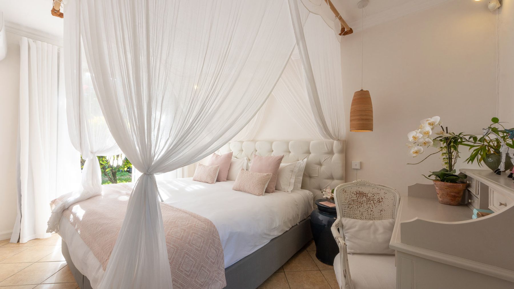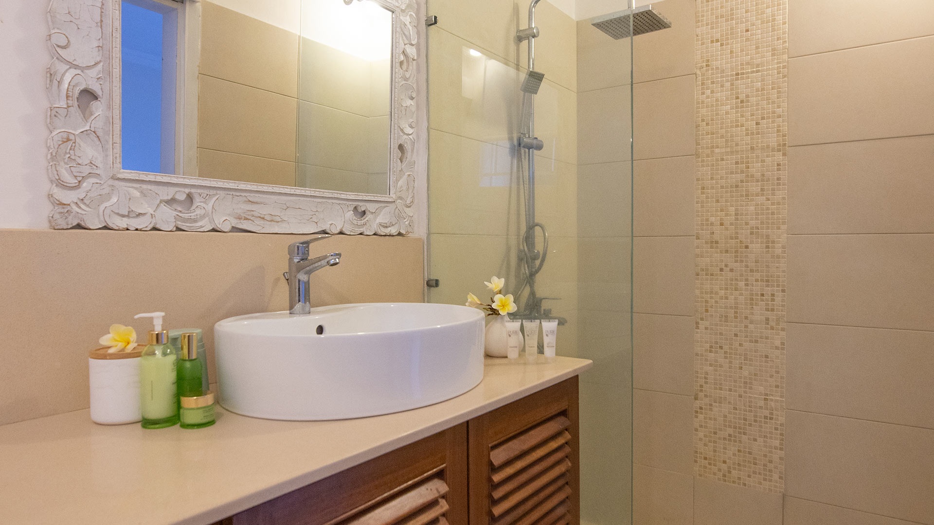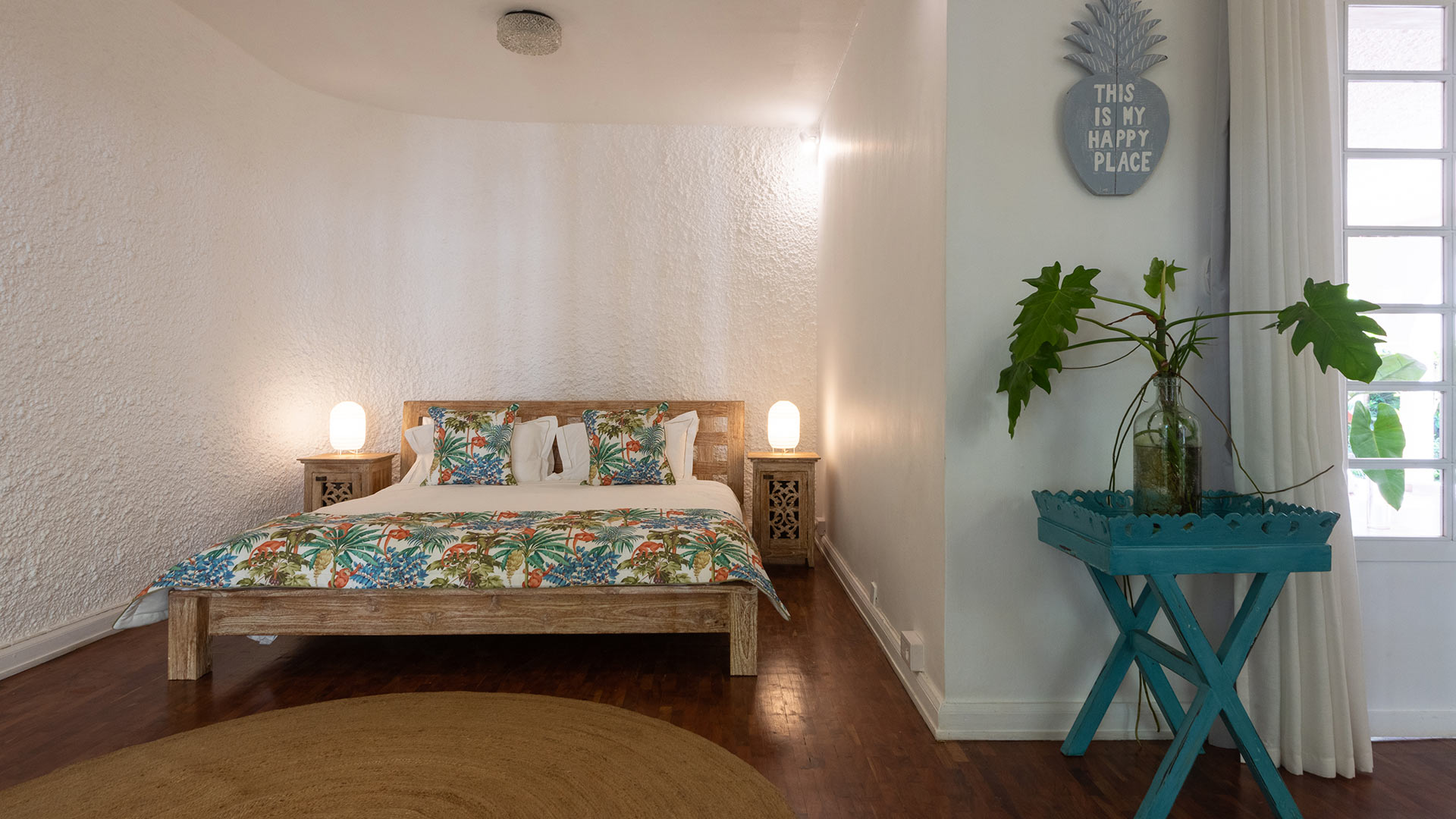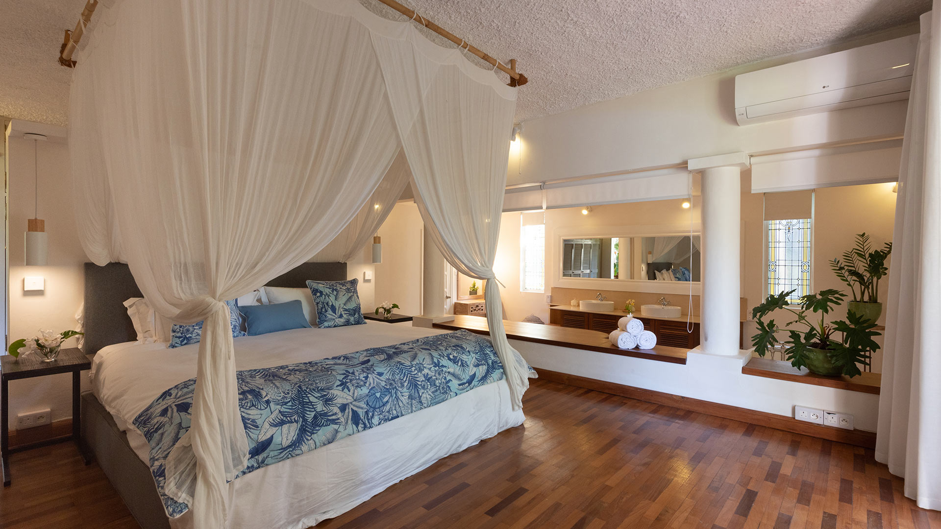 Les chambres spacieuses, situées d’un côté de la villa, s’ouvrent toutes sur la terrasse et le jardin. Une grande terrasse centrale sépare la zone nuit des espaces de vie et de cuisine ouverts, favorisant un art de vivre intérieur/extérieur typiquement mauricien.