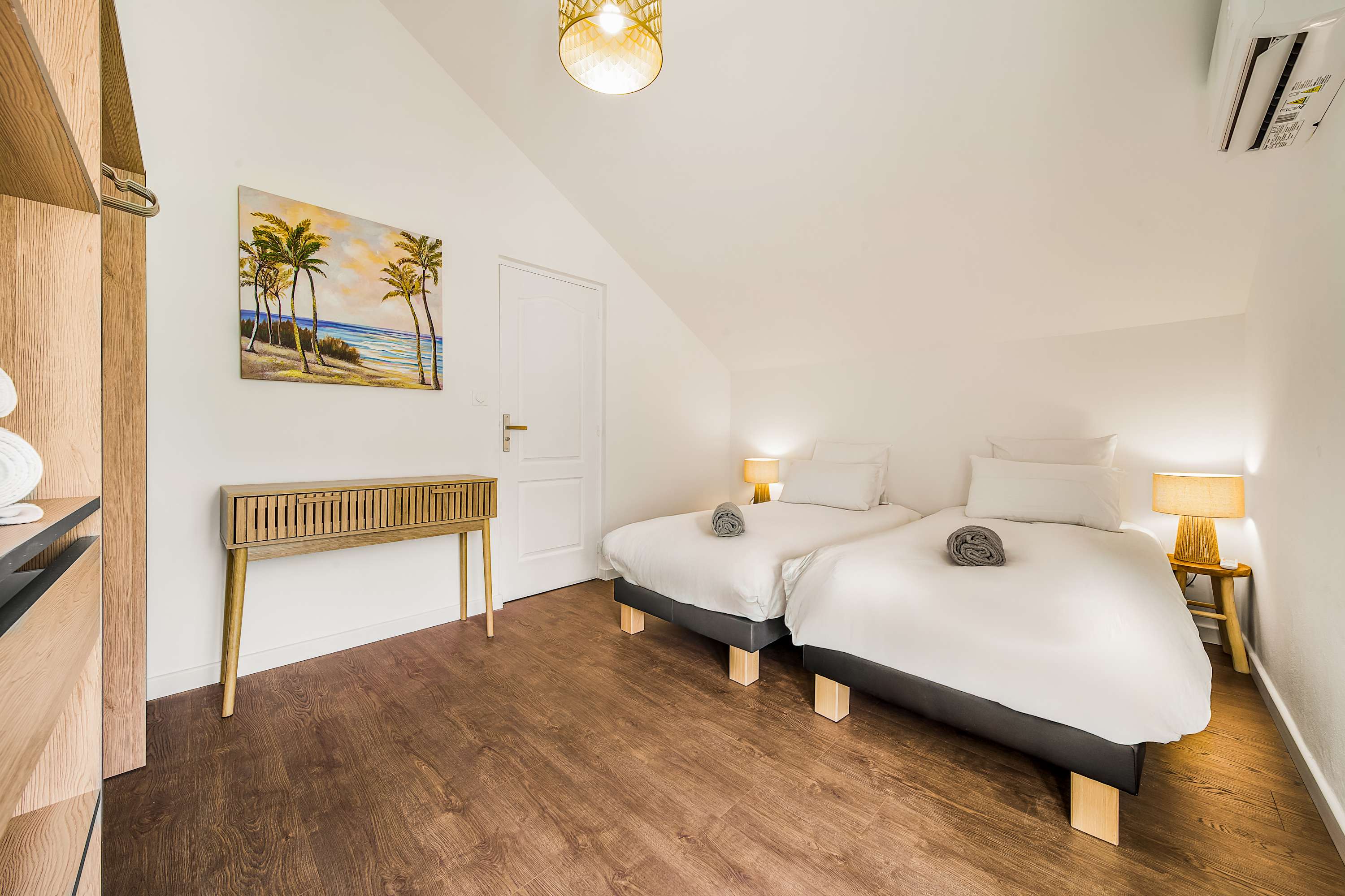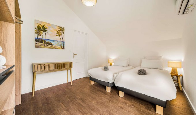 Deux lits simples séparés, parfaite pour des enfants ou deux adolescents, avec placard de rangement et petit balcon (vue plus discrète)