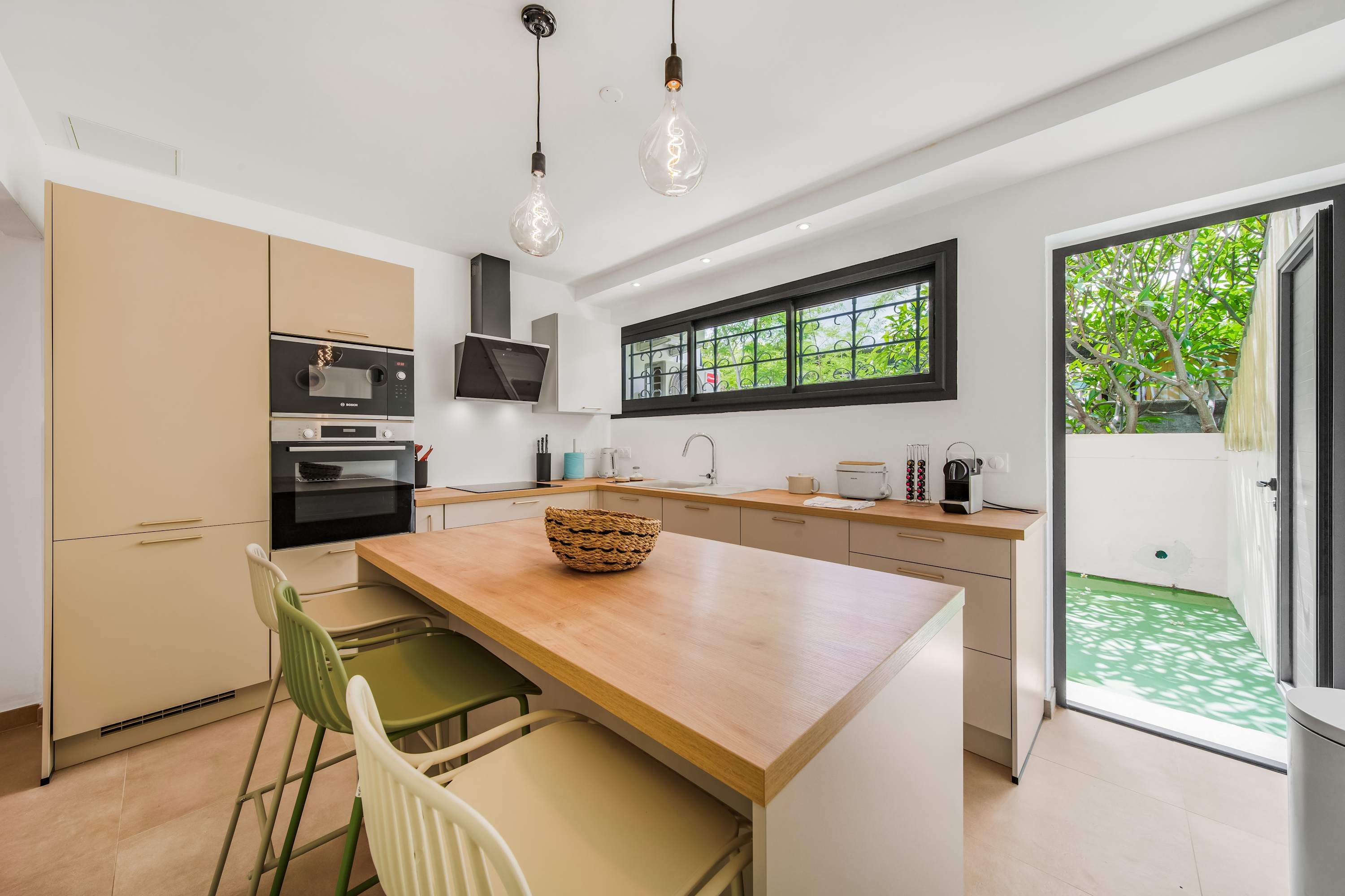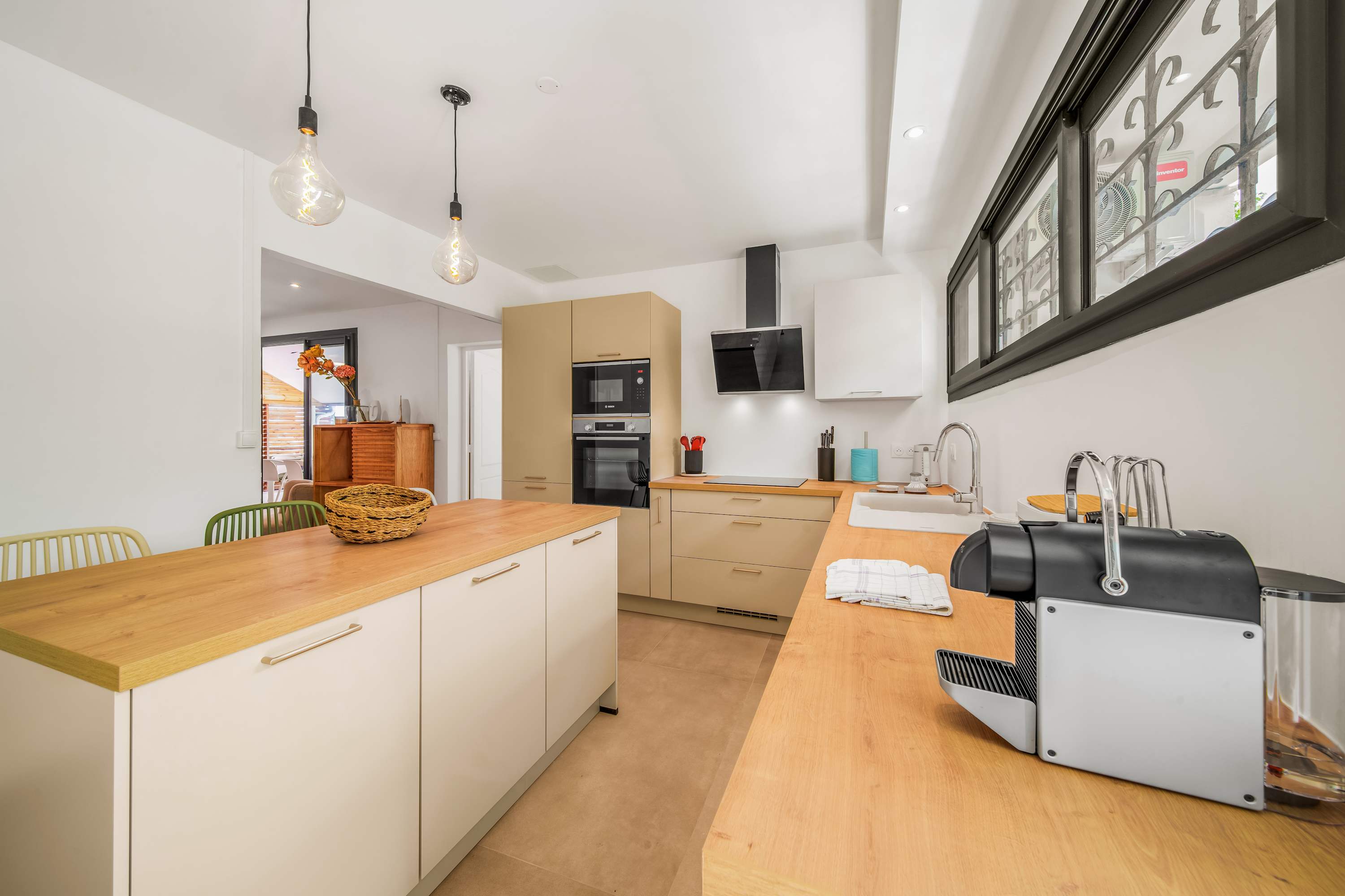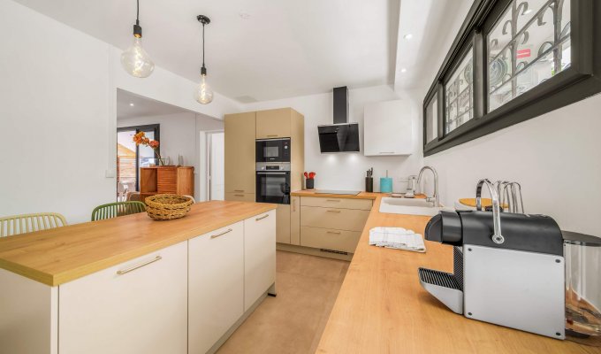 La cuisine est entièrement équipée pour la location saisonnière, avec notamment un lave-vaisselle, une cafetière Nespresso ou encore tous les ustensiles pour préparer de petits repas. en famille ou entre amis.