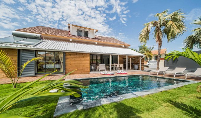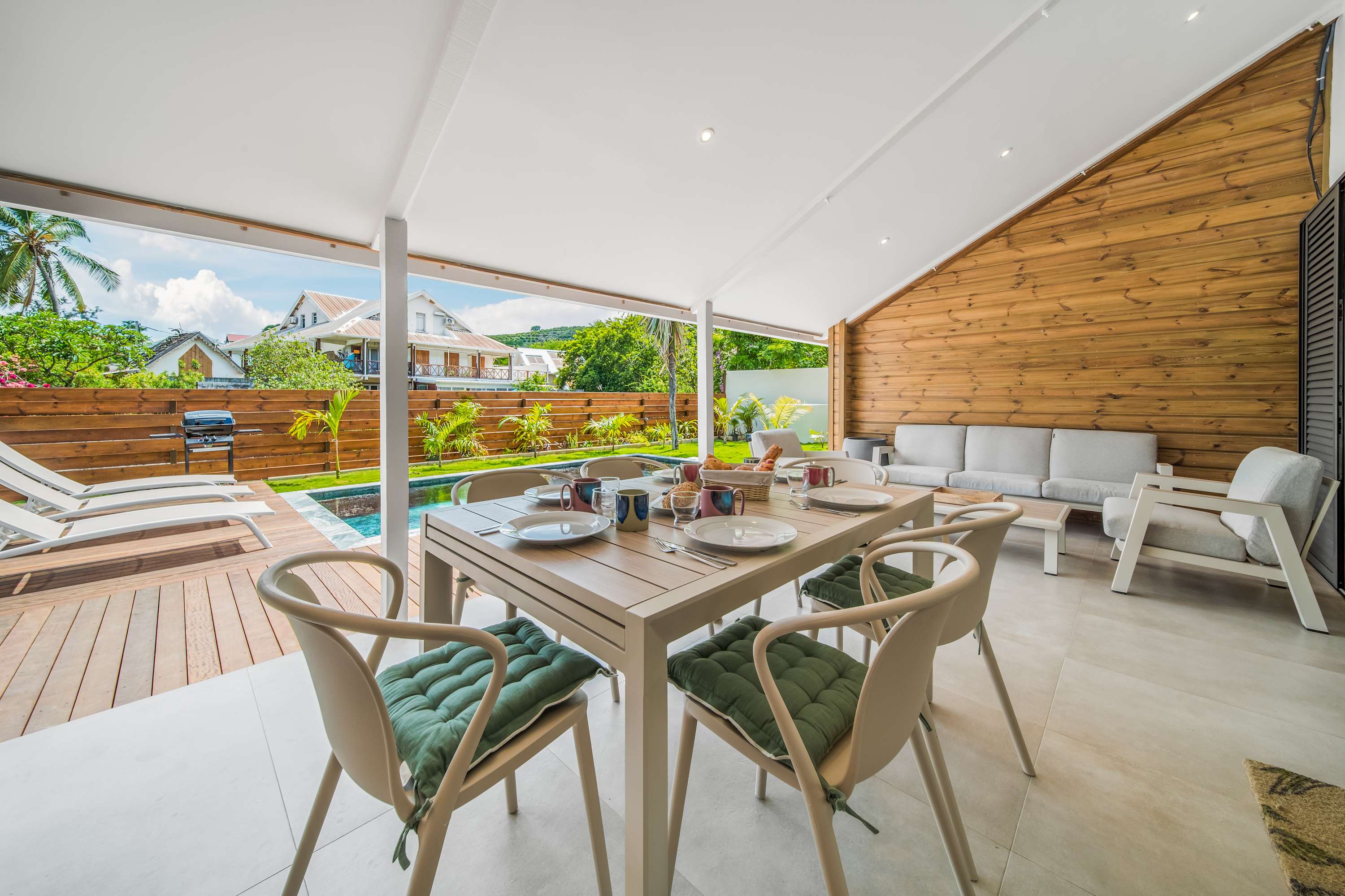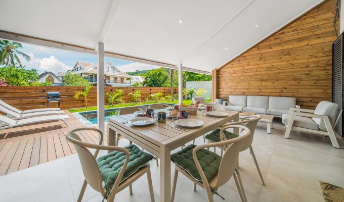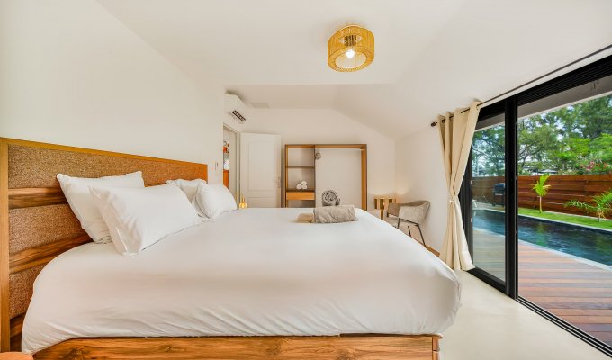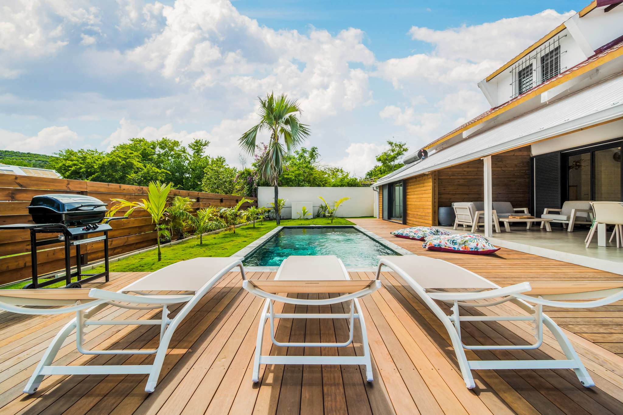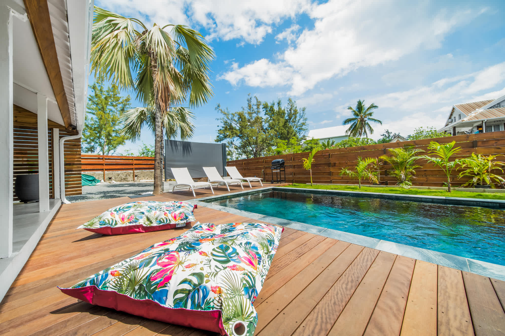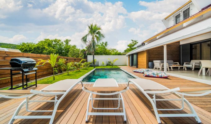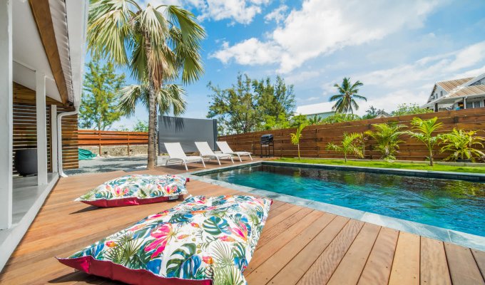 Dès l’arrivée, en poussant le portail, vous découvrez une belle piscine et un jardin tourné vers l’extérieur, avec une vue dégagée sur l’esplanade de Boucan Canot.