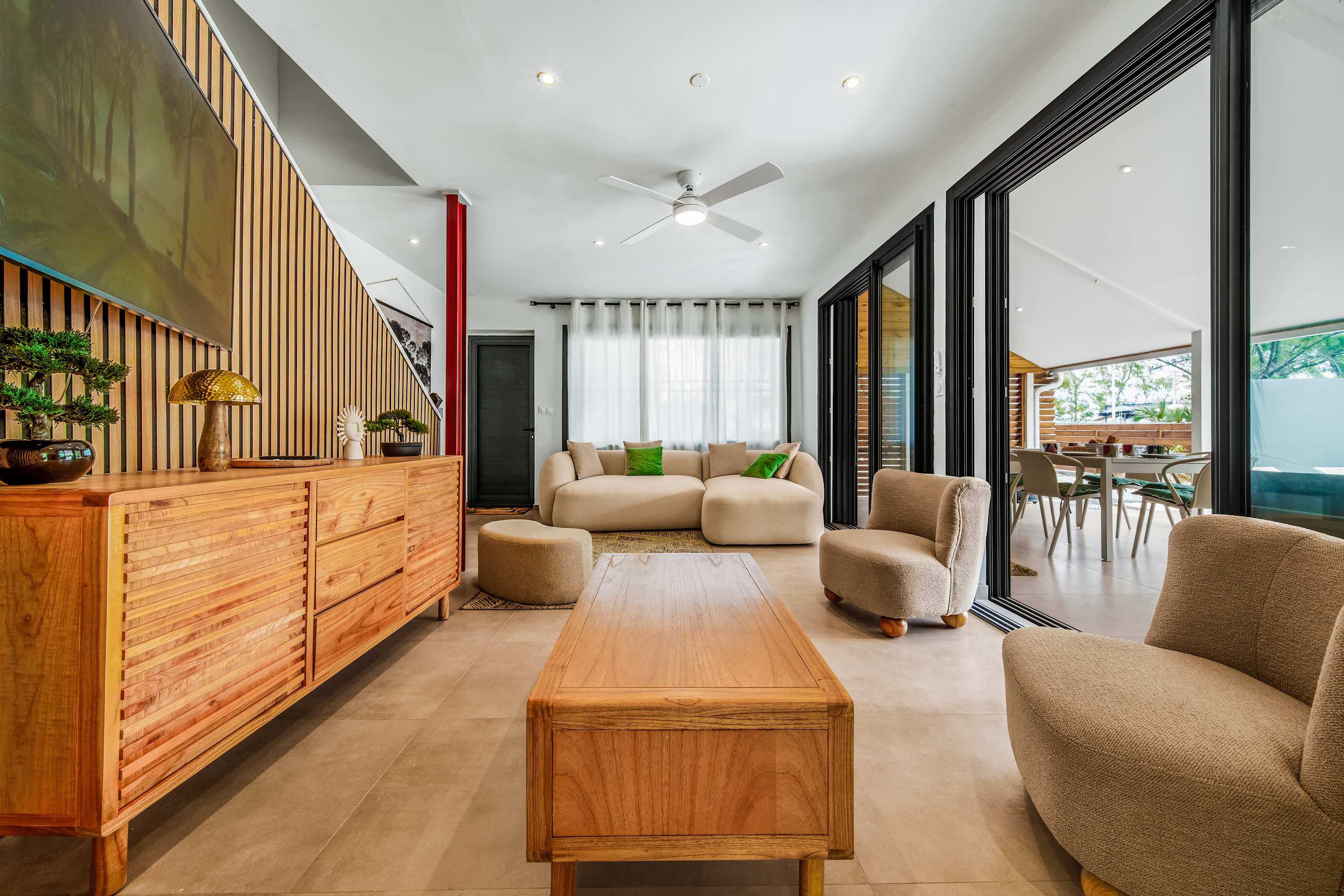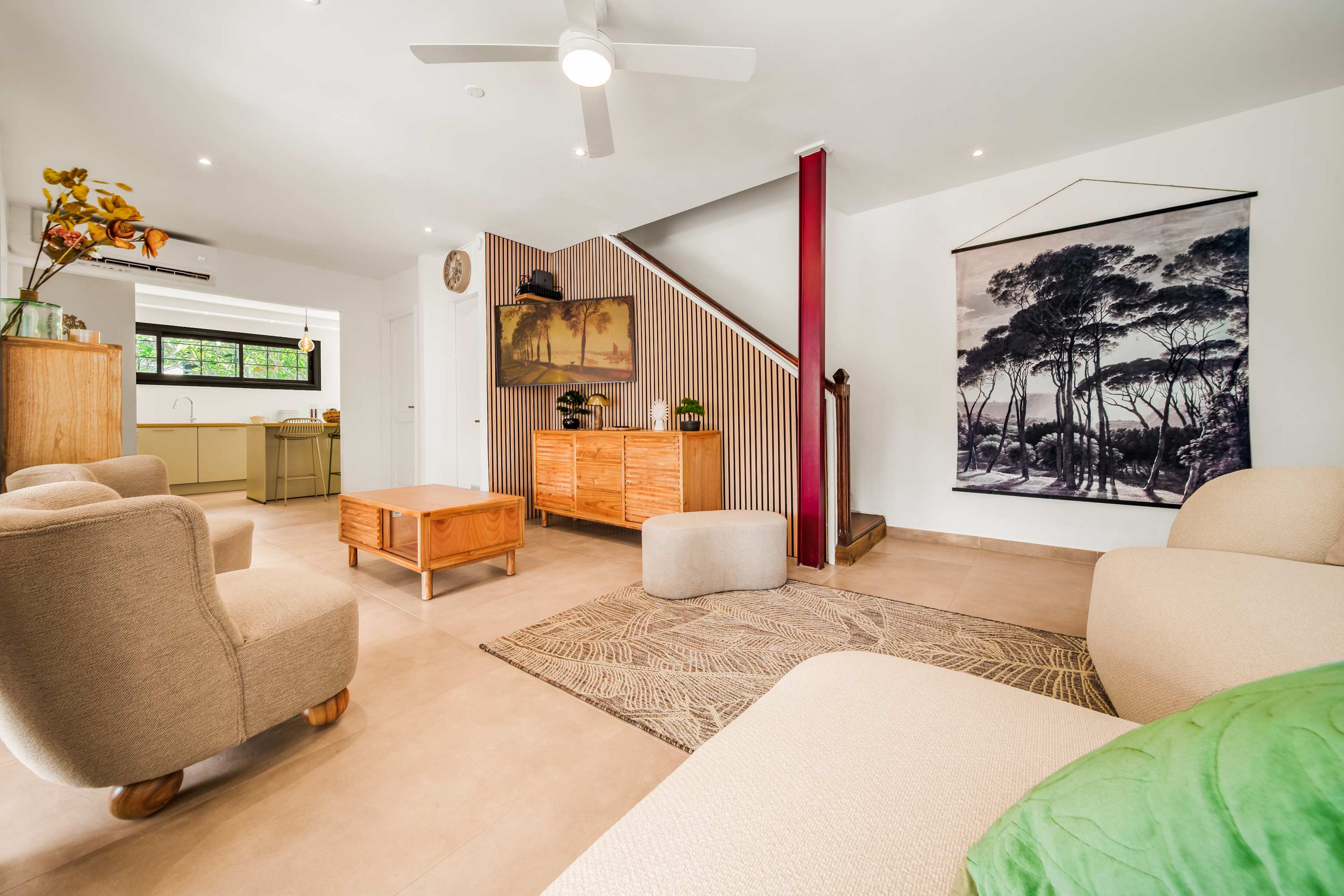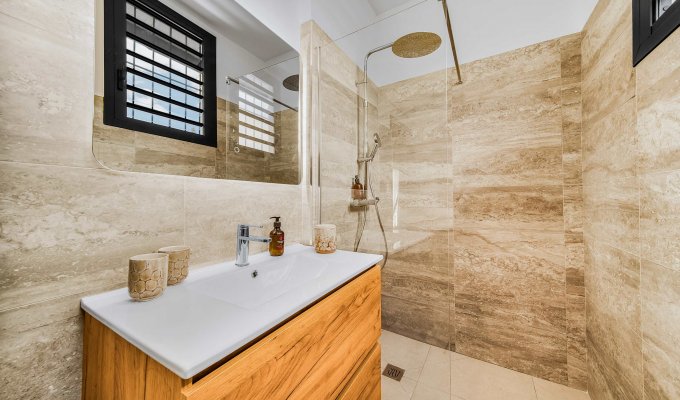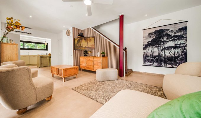En entrant dans la villa, vous arrivez directement sur un salon avec cuisine ouverte, lumineux et convivial.