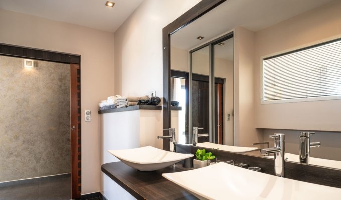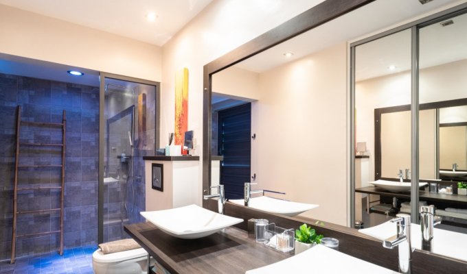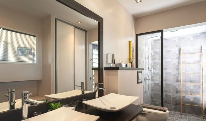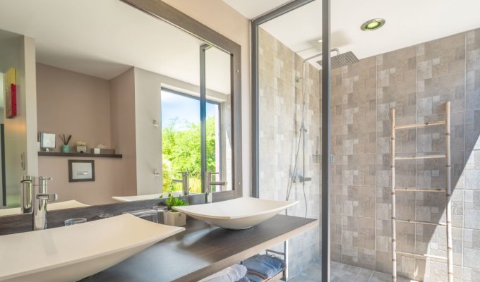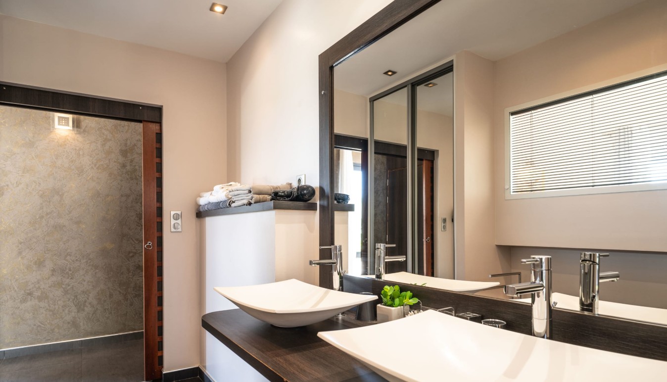 Les matériaux nobles et les bois exotiques confèrent à la villa une authenticité remarquable, tout en bénéficiant des dernières technologies pour un confort moderne. Orientées plein sud, la piscine et la terrasse avec jacuzzi profitent d’un ensoleillement optimal tout au long de la journée.