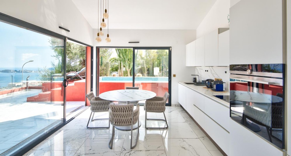 LOCATION SAISONNIÈRE – à Beaulieu-sur-Mer. Villa moderne avec vue mer panoramique dans un quartier résidentiel en hauteur, cette villa contemporaine récente d'environ 110 m² offre une vue spectaculaire sur la baie, dans un cadre calme et privilégié.Elle se compose d'un séjour lumineux avec cuisine ouverte, ouvrant sur une grande terrasse ensoleillée et une piscine (env. 5 m x 2,4 m). Deux chambres avec salles de douche, dont une suite parentale à l'étage avec terrasse et vue mer. En rez-de-jardin, une troisième chambre indépendante avec salle d'eau. Buanderie en sous-sol.