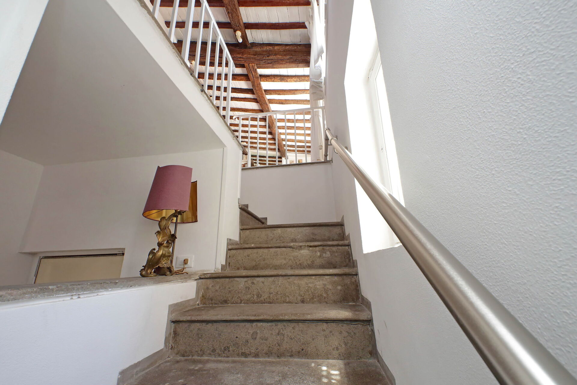 L'appartement est aménagé sur deux niveaux avec un escalier intérieur (10 marches). Le salon, la cuisine et la terrasse se trouvent au premier étage, tandis que les deux chambres et les salles de bains sont situées au rez-de-chaussée.